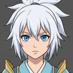 A stoic 3D anime ice paladin character featuring spiky white hair, piercing light blue eyes, and formidable white and blue heavy armor with large gauntlets and a hooded cape. Her...